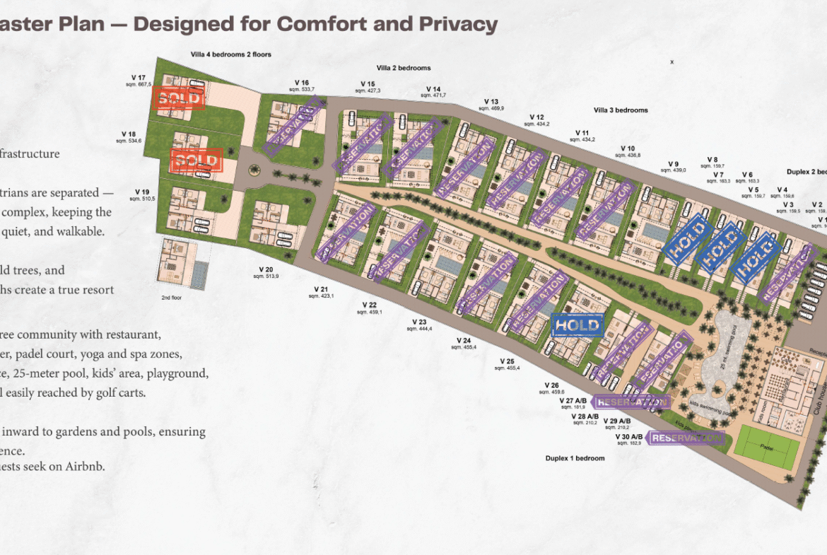 • Community amenities: restaurant, bar, fitness center, yoga & spa zones, padel court, 25-meter pool, co-working space, kids’ area, playground, and shops